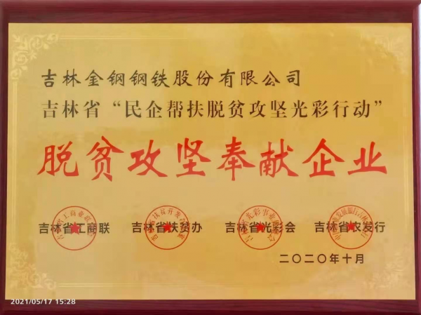 公司在吉林省“民企帮扶脱贫攻坚光彩行动”中,被吉林省工商联、吉林省扶贫办、吉林省光彩会、吉林省农发行等联合评为“脱贫攻坚奉献企业”。